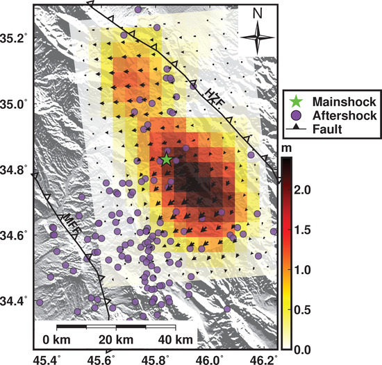 - Our estimations of the strike, dip, and rake retrieved with a uniform slip and distributed slip agree with the USGS solution that is based on body waveform data. The uniform model reveals that co-seismic surface deformation was caused by a fault with a length of 38.5 km, width of 17.7 km, and strike and dip angles of 356° and 17°, respectively. The slip distribution showed that the maximum slip was approximately 2.5 m. The average rake angle and slip were 126.38° and 0.72m, respectively. If the rigidity modulus of the region is assumed to be 30 GPa, then the seismic moment based on the slip distribution was 1.16 × 1020 N·m, which is equivalent to Mw 7.34. This earthquake was a thrust fault event with a slight right lateral slip component.
