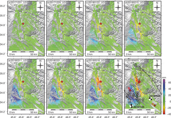 Time series of the cumulative up-down (UD) deformation from 19 November 2017 to 3 June 2018 (positive and negative values represent uplift and subsidence, respectively). The black circles indicate aftershocks (MW > 3.0) up to 220 days after the mainshock. The brown squares represent the selected feature patch. The two beach balls represent earthquakes > MW 5.0. Red stars represent the epicenter.