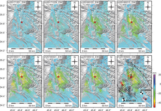 Time series of the cumulative horizontal east–west deformation from 19 November 2017 to 3 June 2018 (positive and negative values represent eastward and westward movements, respectively). The black circles indicate aftershocks (MW > 3.0) up to 220 days after the mainshock. The brown squares represent the selected feature patch. The two beach balls represent earthquakes > MW 5.0. Red stars represent the epicenter.