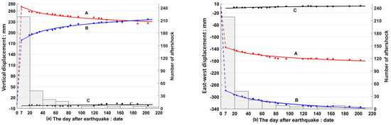 where is the initial displacement of the mainshock (mm), is the cumulative deformation (mm), is the time after the earthquake (day), and is the amplitude. The co-seismic interferometric pairs covered the post-seismic period (Table 2) and unified the co-seismic deformation values up to seven days after the mainshock. The co-seismic deformation was then set as the initial value of in Equation (6). Figure 11 shows the fitting results of patches A and B as solid lines. The post-seismic cumulative deformation time series of Patch A contained co-seismic deformation values of 271 and −135 mm in the UD and EW directions, respectively, and that of Patch B contained co-seismic deformation values of 179 and −279 mm in the UD and EW direction, respectively. The frequency of aftershocks (>MW 3.0), which occurred frequently within 20 days (a total of 214 occurrences), but then decreased gradually, is shown in the histogram in Figure 11.