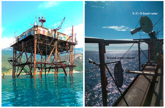 An Oceanographic Platform (left) and X-/C-/S-band radar and X-band scatterometer mounted at the Platform (right).