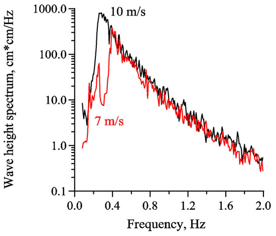 First of all let us characterize wind waves in the experiments from the Oceanographic Platform. It has been mentioned that the observations were carried out at moderate wind velocities ranged from about 7 m/s to 10 m/s. Typical examples of the frequency spectra of wave heights at different wind speeds are shown in Figure 2. The periods TDWW of DWW were in the range of 2.5 s–3.5 s at wind velocities of 7 m/s–10 m/s, respectively. Mean wave heights varied from about 20 cm to 40 cm. Significant waves heights HS were estimated as 35 cm at wind velocity of 7 m/s and 60 cm at wind velocity of 10 m/s. One should remind that the experiments were conducted in the coastal zone, therefore the characteristics of DWW differ from those for the open ocean.