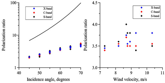 Experimental values of the mean PR vs. radar incidence angle (left) and vs. wind velocity (right) obtained from measurements with the three-band radar for clean water in X-, C- and S-bands (blue, red and black symbols, respectively). The curve is PR calculated according to two-scale Bragg theory [1]. Wind velocities range is 7 m/s to 10 m/s, radar azimuth angles vary from zero to ±30°, that is, close to upwind directions.