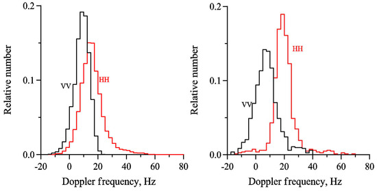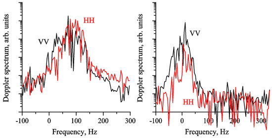 Examples of radar Doppler spectrum near a DWW crest (left) and near a DWW through (right). Black curves–VV-polarization, red curves–HH-polarization. Upwind observations, wind velocity is 10 m/s.