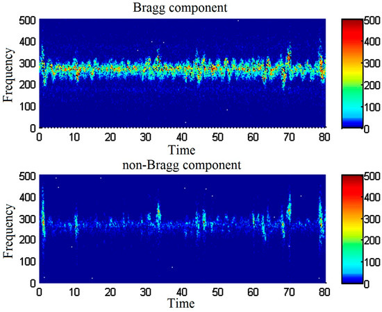 Spectrograms of radar backscatter at VV and HH polarizations (two upper panels) and of Bragg and non-Bragg components of radar return (two bottom panels). Upwind observations, wind velocity of 8 m/s, incidence angle of 60°. The frequency offset 250 Hz corresponds to “zero” Doppler shift, time in seconds. Clean water.