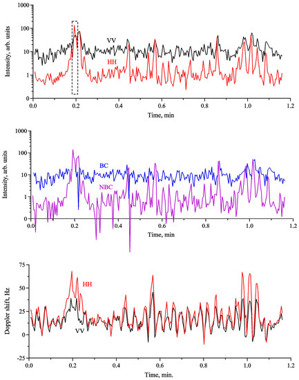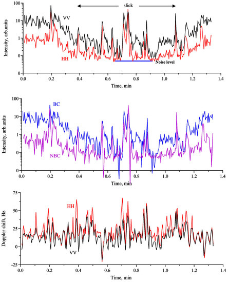 Variations of backscattering at VV- and HH-polarizations in slicks are in general similar to ones in non-slick areas, namely, moderate radar backscatter variations with periods of DWW alternate with more rare spikes. Figure 7 shows simultaneous time series of radar VV-/HH-backscatter, BC and NBC and radar Doppler shift. The slick is characterized by the following averaged contrasts: KVV ≈ 8, KHH ≈ 4, KBC ≈ 17, KNBC ≈ 4. The contrasts, although being of the same order of magnitude, nevertheless differ from each other and show that VV-polarised radar backscatter, as well as BC component, is more strongly suppressed in slick than HH- and non-Bragg components. The suppression of BC is associated with enhanced viscous damping of Bragg cm-scale waves due to films, while the suppression of NBC is related to weaker damping of longer dm-scale waves and suppression of related nonlinear structures, presumably responsible for formation of NBC. The relation between different contrasts, however, is not universal (see, for example, [18]) and can vary depending on meteorological conditions, film characteristics, sea state and so forth.