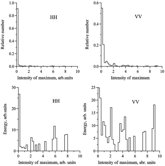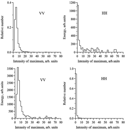 Similar conclusions can be made from histograms of local intensity maxima and from distribution of energy of the maxima versus their intensity for the case of slick (see, Figure 9). The main difference from the previous case is that the energy contained in spikes is even larger than in the “background” modulation maxima and this effect is stronger for VV-polarization. We can explain this by stronger damping of the Bragg component (contrast about 17, see above) contributing mostly to VV-component in slick compared to NBC which mostly relates to spikes.