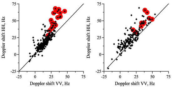 Doppler shifts of HH-polarized backscatter vs. Doppler shifts of VV-polarized radar return for clean water (left) and for slick (right). Red symbols denote Doppler shift in spikes, which intensity is two times greater than the mean HH-backscatter level. Wind velocity is 10 m/s.