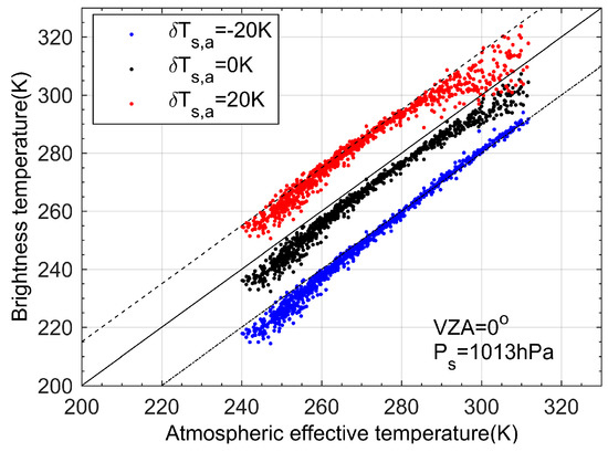 Brightness temperature of Moderate Resolution Imaging Spectroradiometer (MODIS) channel 31 versus atmospheric effective temperature for various δTs,a values. Atmospheric effective temperature was defined by the DLR and atmospheric effective emissivity that was simulated using MODTRAN and 875 TIGR2002 profiles.