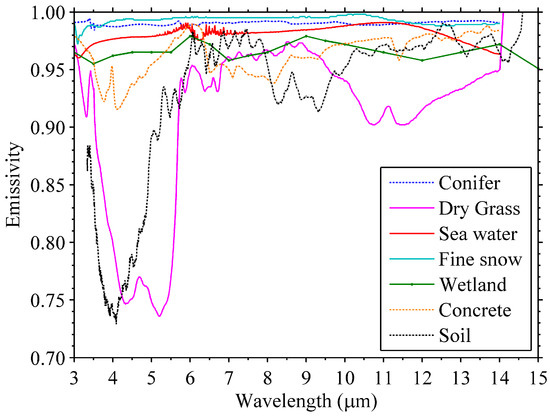 For each atmospheric profile, the DLR, TOA radiance, and BT of MODIS thermal channels were simulated for various surface types, viewing angles, elevations, and δTs,a. Version 4.0 of the MODTRAN radiation model was used for simulation. Downward surface radiances at nineteen different zenith angles (0° to 85° at 5° interval, and 89°) were computed for wave numbers ranging between 100 and 3333 cm−1 at a resolution of 1 cm−1. Such values were then integrated to obtain the total DLR according to Equation (1). The model was configured to use ozone and trace gases from a climatological data set and the “Rural” aerosol with horizontal meteorological visible thickness 23 km, all available from MODTRAN. Seven surface types (conifer, dry grass, sea water, fine snow, wetland, concrete, and soil) with distinctly different emissivity spectra, seven elevations, eight VZA, and nine δTs,a values were used to simulate TOA radiance and brightness temperature. Surface emissivity spectra were from the ASTER spectral library, and their spectral emissivity are described in Figure 3. To obtain atmospheric profiles at various elevations, profiles from 40 to 34 layers were used, and average elevations of the lowest seven layers were 0.002, 0.454, 0.934, 1.410, 1.885, 2.670, and 3.511 km. The VZA varied from 0° to 70° at a 10° interval. Ts was assumed to be different from Ta, and the δTs,a was between −20 K and 20 K at 5 K intervals. Knowing DLR and BT, ε31 defined by BT were calculated using Equation (3). IWV for each condition was calculated by MODTRAN directly.