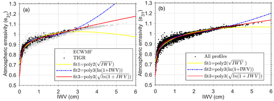 Atmospheric emissivity (ε31) defined by Equation (3) using brightness temperature (BT) of MODIS 31st channel, plotted as functions of IWV at the condition of conifer surface, H = 1.435 km, view zenith angle (VZA) = 0°, and δTs,a = 0 K. The black and gray dots represent TIGR2002 and ECWMF profiles, respectively. Only the TIGR2002 profiles were used in regression in Figure (a), and all the TIGR2002 and the ECWMF profiles were used in Figure (b). Poly2 and poly3 represent quadratic and cubic function, respectively.