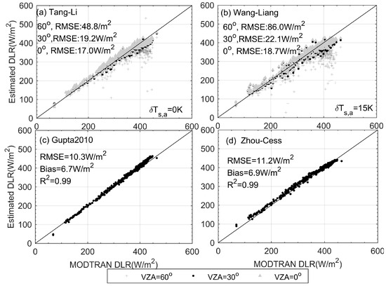 The Gupta2010 and Zhou-Cess algorithms performed well, with RMSEs of 10.3 and 11.2 W/m2 (Figure 7). The new parameterization had a smaller RMSE (about 5 W/m2) than the two algorithms for VZA ≤ 50° (comparing Figure 6 and Figure 7) but had a slightly larger RMSE (about 1 to 9 W/m2) than the other two algorithms at larger VZAs. However, when the two algorithms were applied to actual satellite data, DLRs from them were greatly influenced by the uncertainty of Ta, which was difficult to retrieve accurately using satellites, especially for those without the TIR sounding channels.