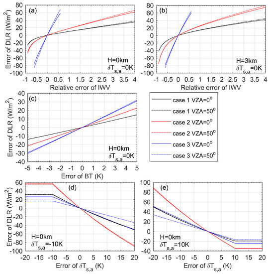 Figure 8d,e show the DLR sensitivity to the error of δTs,a when the ground was 10 K cooler or warmer than the surface air. The DLR error linearly increased with the absolute error δTs,a and reached its positive (or negative) maximum when the δTs,a error was −10 K (or 10 K) for δTs,a = −10 K (or 10 K) because δTs,a was set within ±20 K in the DLR calculation. DLR was more sensitive to δTs,a for high-BT and low-IWV conditions (Case 2) than other cases. Furthermore, the DLR error difference between 0° and 50° was only 1 to 2 W/m2 for Cases 1 and 2, but it reached 17.3 W/m2 for Case 3. The figure indicated that if δTs,a was ignored in DLR estimation, which meant the δTs,a error was 10 K (or −10 K) for δTs,a = −10 K (or 10 K), DLR would be underestimated by 27.3, 48.3, and 25.9 W/m2 (or overestimated by 23.1, 40.9, and 25.2 W/m2) for Cases 1, 2, and 3 for VZA = 0°. Therefore, we suggest that δTs,a should be considered for the bare soil, sand, and dry grass surfaces, especially for deserts where higher Ts and lower Ta and high BT and low IWV frequently exist in the daytime. Also, the δTs,a is non-negligible for an ice surface where Ts is much lower than Ta.