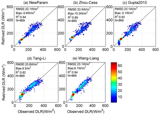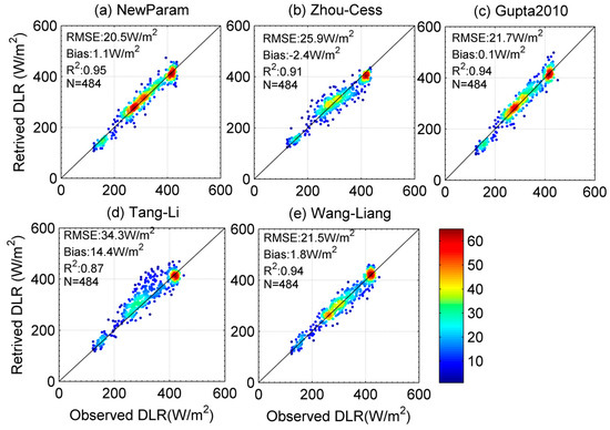 Comparison between MODIS-estimated DLRs and in-situ measurements at the sites in ordinary regions. Figures (a) to (e) represent the results from the new parameterization (NewParam), Tang-Li, Wang-Liang, Zhou-Cess, and Gupta2010 algorithms. The color bar represents data density that ranges from 0 to 100 percent of the data.