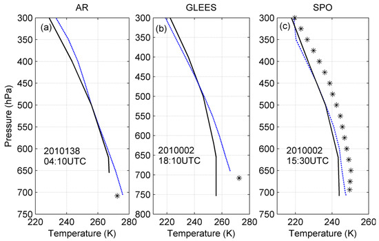 Vertical distribution of air temperatures from the National Centers for Environmental Prediction (NCEP) and MOD07 profiles at sites Arou (AR), US-GLE Wyoming (GLEES), and South Pole (SPO). The solid line, dashed line, and asterisk represent MODIS, NCEP, and field-measured data, respectively.