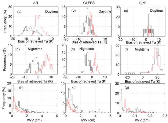 Figure 13 shows the histograms of IWV and bias in Ta from the two products at these sites. MODIS-derived Ta had a median bias of about −10 and −4 K for daytime and nighttime at AR, while the NCEP-derived Ta was better during the daytime. The distribution of bias in Ta from NCEP was more centralized toward zero compared to that of MODIS at the GLEES site. The MODIS IWV had some large IWV values at AR and GLEES, which were unreasonable, whereas these very large values were smoothed by NCEP data. For the SPO site, we found the number of underestimated Ta from MODIS was deduced, and the IWVs negative biases during winter that were mentioned in Section 4.2 were decreased after using NCEP data compared to those from MODIS.