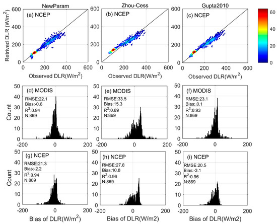 The results of DLRs at the sites in high-altitude regions. Scatter plot between DLRs estimated from NCEP atmospheric parameters and observed DLR are shown in (a–c). Error histograms between observed and retrieved DLRs from MODIS (d–f) and from NCEP (g–i). Bias was computed as retrieved minus observed values. The left, middle, and right panels represent the results from the new parameterization, the Zhou-Cess, and the Gupta2010 algorithms, respectively.