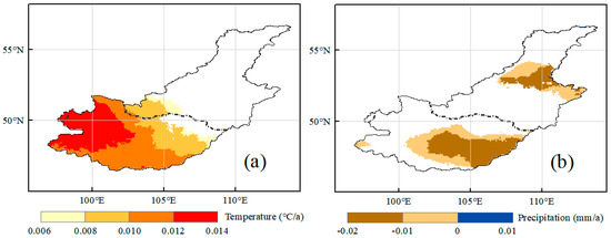 Spatial distribution of the change trends (p < 0.05) of the average annual temperature (a) and precipitation (b) over the Selenga-Baikal Basin from 1982 to 2015. The blank represents p > 0.05, which is not significant.