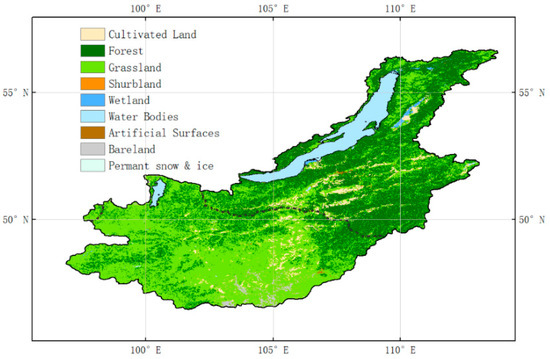 As shown in Figure 5, grassland, forest, water bodies, cultivated land, and bare land account for 51.05%, 36.91%, 6.48%, 3.54%, and 1.34% of the total basin, respectively, while other land use types account for less than 1%. Grassland, which occupies more than half of the entire basin, is the most predominant land cover and is mainly distributed throughout the Mongolian sector. Forest is another predominant land cover over 37% of the total area, and it is mainly distributed in the Russian parts. Cultivated land is mainly distributed in river-lined areas of the Uda River and the lower reaches of the Selenga River, and bare land is mainly distributed in the southern part of Mongolia. Below, we focus our analysis on forest and grassland.
