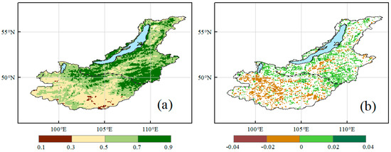 The mean NDVI in the growing season (from May to September according to Lavrentyeva, Merkusheva and Ubugunov [52]) exhibited a spatially heterogeneous pattern from 1982 to 2015 (Figure 6a). As expected, the NDVI generally followed the spatial pattern of the vegetation types identified in this area with higher values in forested areas to the north and lower values in the grassland. The mean NDVI of forest, which was mainly distributed in the northwestern and southeastern parts of the Selenga-Baikal Basin, was 0.667. Grassland, which covered the southern part of the basin, had a relatively low mean NDVI (0.542).