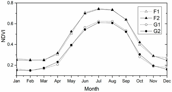Annual NDVI time series for forest and grassland from 1982–1999 and 2000–2015. F1: forest during 1982–1999; F2: forest during 2000–2015; G1: grassland during 1982–1999; G2: grassland during 2000–2015.
