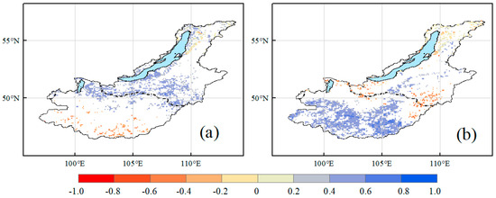 A partial correlation analysis was performed to evaluate responses of the NDVI to air temperature and precipitation. As shown in Figure 8, there were notable spatial differences in the partial correlation coefficients between the mean NDVI during the growing seasons and the annual temperature and precipitation. In general, the NDVI was negatively correlated with air temperature and positively correlated with precipitation in the southern part of the Selenga-Baikal Basin, which is within Mongolia. However, the NDVI was positively correlated with air temperature east of Lake Hovsgol, where the annual precipitation exceeds 400 mm (Figure 2). Additionally, the NDVI was negatively correlated with precipitation and positively correlated with temperature in the southeastern basin, which is near the national border between Mongolia and Russia.