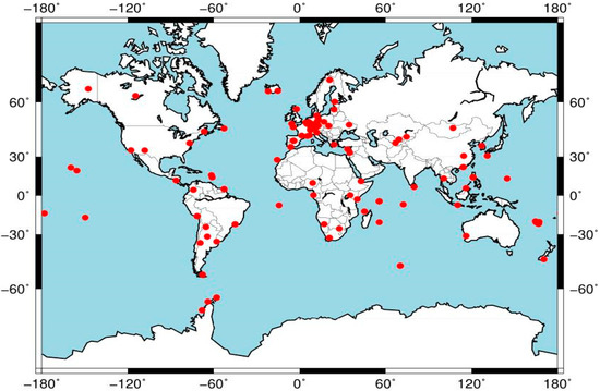 Distribution of the 114 International GNSS Service (IGS) stations.