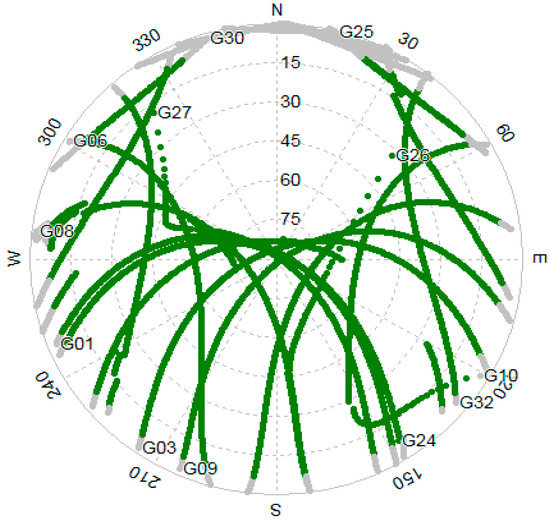 The satellite clock error is one of the main errors which affect the positioning accuracy. It is important to compute the precise satellite clock errors of code and phase observations for improving the positioning accuracy. The estimated, reparameterized satellite clock errors of L1/L5 and P1/P5 are computed with Equation (10). Therefore, performance of the different results for IFCB estimated with different methods in SPP is used to validate the application of the time-varying code bias in positioning. Methods 1, 2 and 3 are used to compute the IFCB. In Method 1, IFCB is computed using the sum of the combined DCB products and the time-vary part of IFCB estimated with phase observation. In Method 2, IFCB is computed using the sum of the constant part of the combined code bias and the time-vary part of IFCB estimated with phase observation. In Method 3, IFCB is the combined code bias estimating with Section “Estimation of the combined code bias”. Five days, 9–13 December 2016, of triple-frequency GPS data from IGS stations of BRUX is processed to analyze the performances of these biases in SPP. The number of the visible BLOCK IIF satellites is illustrated in Figure 2. The skyplot of visible BLOCK IIF satellites observed of BRUX on 9 December is shown in Figure 3. Figure 2 and Figure 3 show that the simultaneous visible BLOCK IIF satellites for many epochs are more than 4 and can ensure that the P1/P5 based SPP is implemented. In SPP processing, the final IGS products of the satellite clock and orbit are used. The elevation-dependent function of Equation (9) is used. The settings for the SPP processing are shown in Table 1. It is very important for real-time processing that the high-accuracy bias is obtained by prediction. Therefore, the prediction performance of the combined code bias is discussed based on 20-day .