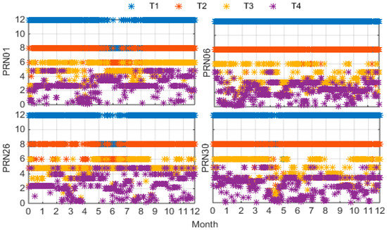 Periods (Ti (i = 1~4), unit: h) of the single–day combined code bias of for PRN01, PRN06, PRN26 and PRN30 over one year.