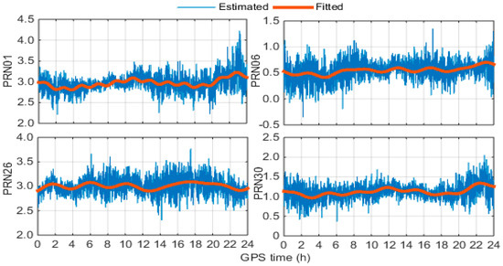 Analysis of FFT shows that the single-day has notable variations with the periods of 12, 8, 6, 4, 4.8 and 2.67 h. One-year single-day periods (Ti (i = 1~4)) of PRN01, PRN06, PRN26 and PRN30 are illustrated in Figure 4. The results in Figure 4 indicate that the estimated combined code biases for all satellites have stable periods of 12, 8, 6 h and the fourth period is irregular. This can be explained that the GPS satellite clock or signals may be affected by other space factors and these factors vary with time. Unfortunately, it is difficult to gain further information about the factors which caused instability of the periods. One day (30 December 2016) estimated results of for PRN01, PRN06, PRN26 and PRN32 are illustrated in Figure 5, which shows that the estimated combined code bias of is not the smooth curve and not similar to the combined phase bias of . This can be explained by the effect of the noise including the multipath of the code observation on the estimated results. From Figure 5, it can be seen that that the values for each satellite are different and vary with time, trend of which is different. The variation indicates the combined code bias of has the time-varying characteristic. This characteristic validates that the combined code bias cannot be replaced by the constant products of satellite DCB (P1–P2) and DCB (P1–P5), although it can be expressed by the function of these DCBs. It also shows that the single-day DCB (P1–P2) and DCB (P1–P5) have the variable characteristic and their time-varying parts are absorbed by the ionosphere delay model in estimating.