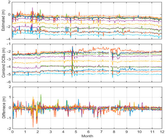 In this section, the characteristic of the estimated combined code bias is discussed based on the observed periods and the used model. The constant part of the combined code bias computed with two methods is compared to analyze the difference between the IGS DCB (P1–P2) and DCB (P1–P5) products and estimated combined code bias. The performance of SPP is discussed to validate the application of the estimated combined code bias.