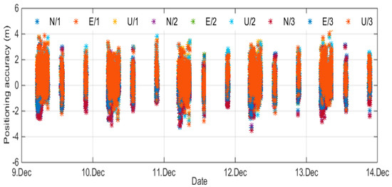 To evaluate the presented method and validate the impact of the time-varying code bias on the satellite clock error, the performance of the computed satellite clock error with Methods 1, 2 and 3 in the P1/P5 based SPP is analyzed. In processing, the elevation-dependent weight of Equation (9) is used. The corrections such as Earth rotation, Earth tides and relativistic effects are implemented. The tropospheric delay is corrected using the Saastamoinen model. An estimator of least squares is used to solve the epoch-wise coordinates in Methods 1, 2 and 3. The IGS final orbit product is used in three strategies. The SPP solution with respect to the ground truth coordinates are computed for three coordinates of north, east and up and the results for the three Methods are illustrated in Figure 7. The RMSs of SPP solution for three coordinates of north, east and up are in Table 2. Figure 7 and Table 2 show that the results for Method of 2 are better than that of 1. This demonstrates the accuracy of the constant part of the estimated combined code bias is better than that of DCB products and further indicates that the DCB products cannot be used to replace the constant part of IFCB. The results for the Methods of 2 and 3 show that the time-varying part of IFCB estimated with phase observation is better than that of code observation. This can be explained by the effect of the noise and multipath on the estimated code-based IFCB.