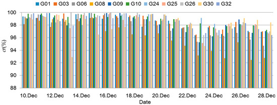 where RMSD is the RMS for the differences between the predicted and estimated values and the RMSE is the RMS of the estimated values. The means of 19-day single-day correction rates of the constant part for each satellite are shown in Figure 8 and the results for the time-varying part are shown in Figure 9. Figure 8 indicates that the predicted constant part of reaches 98% and the attenuation of the predicted accuracy is much less evident. But the Figure 9 shows that the accuracy of the predicted time-varying part decreases significantly with the predicted time.