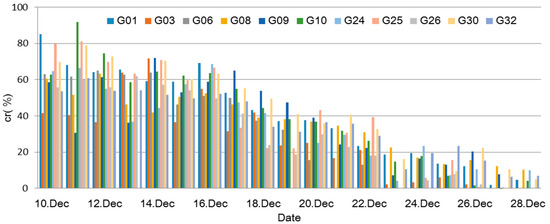 The single-day (9 December 2016) estimated of 12 satellites are used to extrapolate the values of the next days (10–28 December 2016). The mean of the single-day of 9 December 2016 is used to extrapolate the constant of the next days (10–28 December 2016) and its time-varying part is used to fit the modeling coefficients of each satellite and the fitted coefficients are used to extrapolate the values of the next days (10–28 December 2016). The correction rate is defined as: