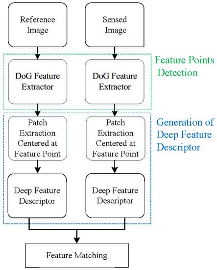 Feature matching is the basis of various remote sensing processing tasks, such as image retrieval [,], object recognition [,] and image registration [,,,]. eature matching can also contribute to calibrate attitude sensor performance [,]. Taking remote sensing registration as an example, feature based methods are also mainstream methods in the practical application. Although image registration methods based on area do not need to extract and match features, they are sensitive to gray changes [,], or are only able to deal with simple geometric deformation, such as translation [] or similarity transform [,]. However, for feature based remote sensing image registration, the acquired number of matched points is vital for estimating the final transform model. If the number of matched points is not enough large, the estimated transform model will be biased or even false [,,,]. For feature matching, there are two main variables: Feature descriptor and similarity measurement. The feature descriptor is always the core and the similarity measurement is dependent on feature descriptors. However, manually designed SIFT (Scale Invariant Feature Transform) [] descriptors may be unable to take into in an optimal manner all the changes in image appearance, such as different viewpoints, different resolution, nonlinear brightness distortions, geometric deformations, geometric characteristic of objects, occlusions and so on. In the community of the remote sensing images, due to the specialty of remote sensing images, the SIFT and its variants designed for natural images do not always perform well []. Especially for non-linear brightness variation, one common problem in remote sensing images is that the calculated principal direction of the SIFT feature point are unreliable, because of the varieties of the statistic of gradients around the feature point. This problem will produce many false matched points or fewer matched points, which results in a mis-registration or failure of registration. So, the descriptor of feature points detected from images with non-linear brightness variation is a bottleneck problem for remote sensing image further processing, especially for the registration task.