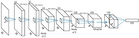 Among the comparison of image patches, the prevailing network is the Siamese network, which has two shared-parameters branches. However, its versatility is limited, especially for the feature point matching task. So, we adopted the non-Siamese network as our description network, named DescNet. The architecture of our network consisted of convolution layers, batch normalization layers, non-linear activation ReLU layers and 2-D dropblock layers []. All the convolution filters had the same small size of , except for the last convolution layer with the size of . The smaller size convolution kernel not only could reduce the number of parameters of network but also could increase the nonlinearity of network. Recently, many researchers found that the pooling layers decreased the performance of the output feature descriptor []. So, the shrinkage of feature map was implemented by increasing the stride of the convolution filter to two instead of carrying out the maxpooling operation. The architecture of model is shown in Figure 3. The details of each layer are presented in Table 1.