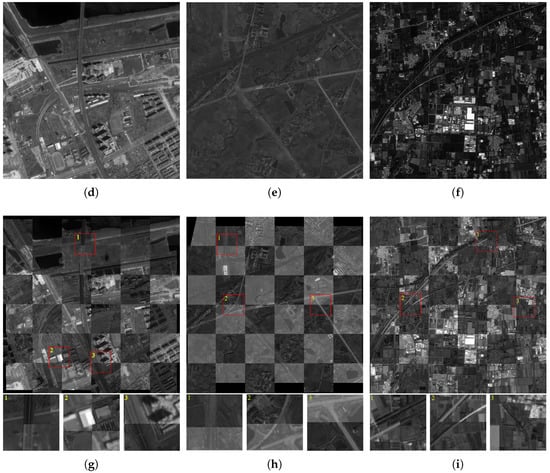 For each column, the top two rows are reference and sensed images, the bottom row is a checkerboard visualization of corrected images. Take image (g) as an example, the area defined by a red square with yellow label number is enlarged to display in the square image with the same label number for clear visualization. The same rule applies to image (h,i). In particular, for a clear visual presentation, the square root method was applied to stretch the grayscale of image (i).