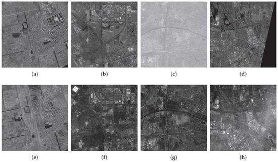 Four samples of test remote sensing images. Each column is a pair of images. Image pair of (a,e) underwent image content changes, image pair of (b,f) and image pair of (c,g) had great gray difference, image pair of (d,h) underwent occlusion by cloud.
