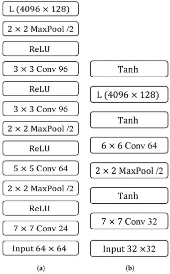 In this section, to validate the performance of our network, DescNet, we compared our network to two other popular networks, the TFeat [] and MatchNet [] networks, the most popular conventional, hand-crafted SIFT descriptors. MatchNet was essentially a Siamese-Network, and consisted of three subnetworks, namely, a feature extraction network, a bottleneck network and a metric network. For a fair comparison, we only adopted its feature extraction network to compare. Its feature extraction network was composed of five convolution layers, and the first two convolution filters size were and , respectively, and the last three convolution filters size were all . The shrinkage of feature map was implemented by the operation of maxpooling. Its input patch size was and the final output feature vector was also a 128-dimension vector. Its architecture schema is shown in Figure 6a. The TFeat network consisted of two convolution layers, whose filters size were and , respectively, with one linear layer and one non-linear activation Tanh layer. Its input patch size was and output feature vector was also a 128-dimension vector. Its architecture schema is shown in Figure 6b. For the SIFT descriptor, it was generated by the algorithm vl_sift provided by the vl_feat toolbox [].