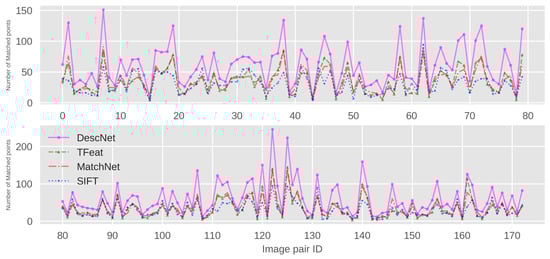 The acquired number of matched points of each image pair for four different methods, DescNet, TFeat, MatchNet and Scale Invariant Feature Transform (SIFT).