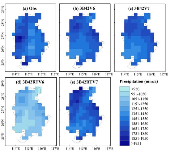 Spatial distribution of annual mean precipitation in the Ganjiang River Basin for TMPA and observed data from 2003 to 2010 (a) Observed data; (b) 3B42V6; (c) 3B42V7; (d) 3B42RTV6; (e) 3B42RTV7).
