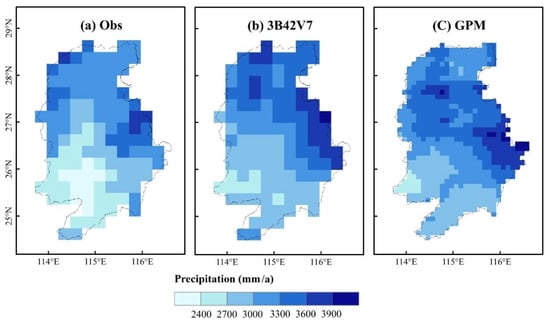 Spatial distribution of annual mean precipitation in the Ganjiang River Basin from GPM, 3B42V7 and Observed data from 2014 to 2015 (a) Observed data; (b) 3B42V7; (c) GPM).