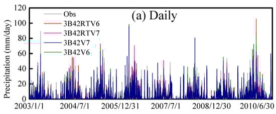 The precipitation time series for TMPA and observed precipitation in the Ganjiang River basin from 2003 to 2010 ((a), Daily; (b), Monthly; (c), Annual).