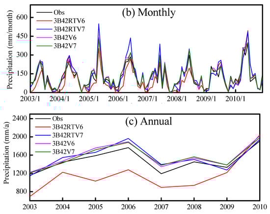 The annual mean TMPA and observed precipitation at different time scales in the Ganjiang River basin from 2003 to 2010 were shown in Figure 4. It can be seen that all of the four TRMM products showed good performance at daily, monthly and annual time scales. However, the 3B42RTV6 product underestimated the monthly precipitation obviously and the product of 3B42RTV7 overestimated the monthly precipitation slightly. As for the annual time scale, it has been greatly underestimated by the 3B42RTV6 precipitation product (Figure 4c). This phenomenon was similar to that of the daily time scale. In addition, it can be found that the TMPA precipitation got its maximum value between May and July, and reached its minimum value around December during the period of 2003 to 2010.