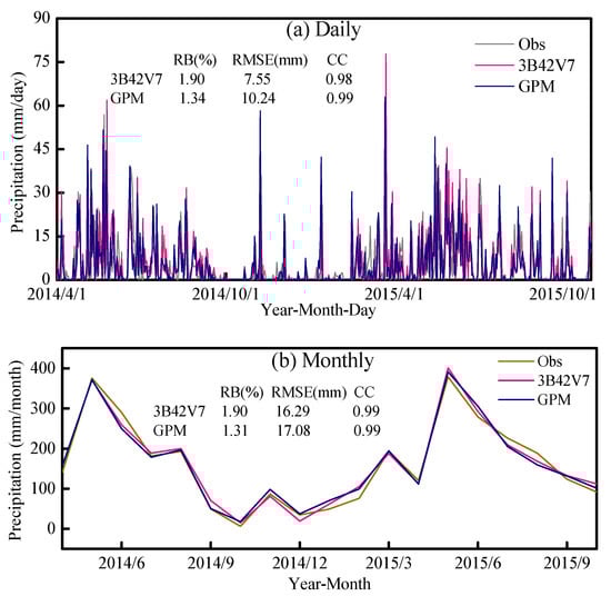 Figure 5 showed the daily and monthly precipitation time series for the GPM, 3B32V7, and observed precipitation in the Ganjiang River basin from May 2014 to October 2015. It can be found that there was a good relationship between the GPM and observed precipitation products at daily and monthly scales. Similar results can also be found between the 3B42V7 and observed precipitation. Both of the 3B42V7 and GPM precipitation products were close to that of gauge observations with high CC value at daily and monthly time scale. In addition, there was only small magnitude of overestimation 1.90% and when it came to the monthly scale 1.34% for 3B42V7 and GPM, respectively. Although the RB value of GPM was better than 3B42V7, the RMSE of GPM was higher than that of 3B42V7 (17.08 mm vs. 16.29 mm).
