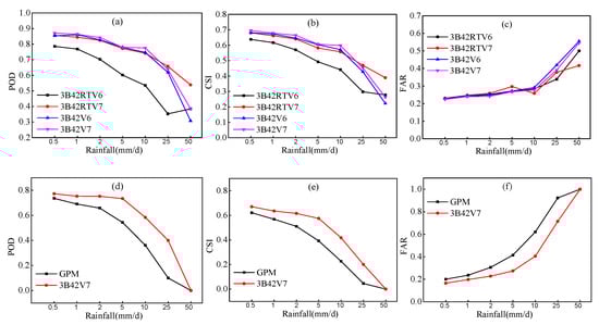 Statistical indices for different rainfall thresholds at daily time scale ((a,d) POD; (b,e) CSI and (c,f) FAR).