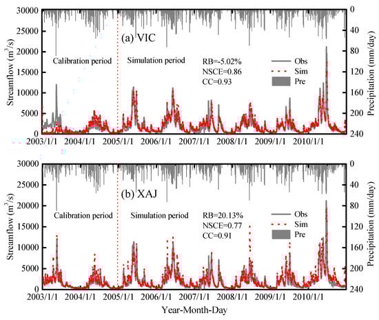 Figure 7 compared the simulated streamflow forced by rain gauge data with the observed streamflow in terms of time series plots at daily scales. The calibration period was selected from 2003 to 2004 and the simulation period was selected from 2005 to 2010. The results showed that both models were good at simulating the daily hydrograph in this basin and the VIC model has a better effect than the XAJ hydrological model. It can be found that a general agreement existed between the observed and simulated streamflow. However, the simulated streamflow consistently underestimates the peaks, especially in the simulation period and in relatively low flow seasons as well (Figure 7a,b).
