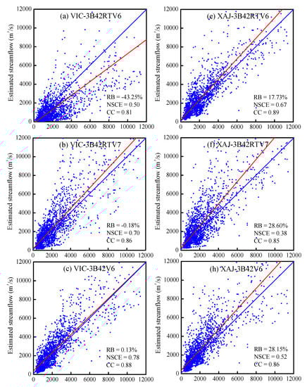 - The 3B42RTV6 and 3B42V7 have good hydrological performance in the streamflow simulation by the VIC and XAJ hydrological models with higher NSCE and CC values. The 3B42RTV6 and 3B42RTV7 demonstrated lower NSCE score (0.50 vs. 0.70). In general, 3B42RTV6 and 3B42RTV7 showed higher CC (>0.8) in simulating stream flow by the VIC and XAJ hydrological model.