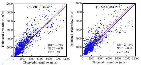 Scatter plots of the observed and simulated streamflow by using VIC and XAJ hydrological models in the Ganjiang River basin ((a–d) VIC; (f–i) XAJ).