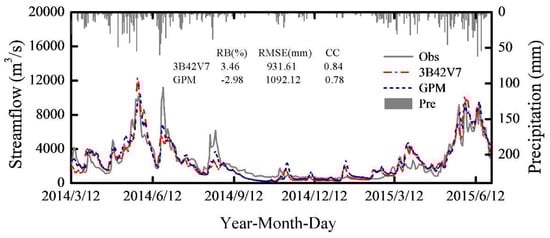 The VIC hydrological model was used to evaluate the 3B42V7 and GPM products hydrologic utility in the Ganjiang River basin during the period March 2014 to June 2015. As was shown in Figure 9, the patterns of the simulated streamflow based on the 3B42V7 and GPM precipitation data by using VIC hydrological model in the Ganjiang River basin were similar to that of the observed streamflow. However, the simulated streamflow consistently underestimated the peaks between 12 June 2014 and 12 December 2014, especially in the period from 12 June 2014 and 12 September 2014. Overall, a good agreement existed between the observed and simulated series in the daily time scales.